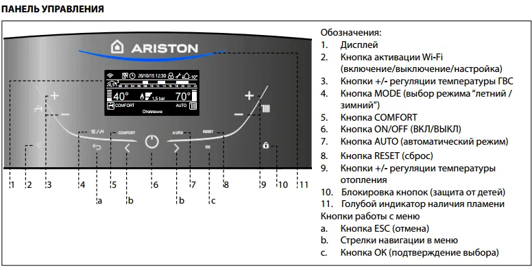 Система автоматики управления с понятным меню позволяет программировать параметры работы, а также отслеживать текущее состояние. Функции защиты от замерзания и закипания, контроля ионизации пламени делают работу оборудования безопасной. Система автодиагностики выявляет ошибки и неисправности.